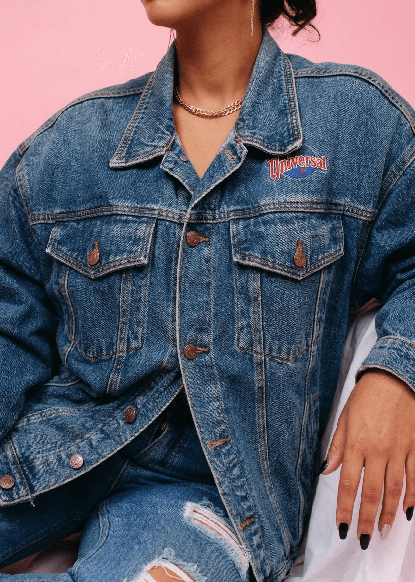 Vintage-style denim jacket with embroidery on a pink background. Photo via Pexels.