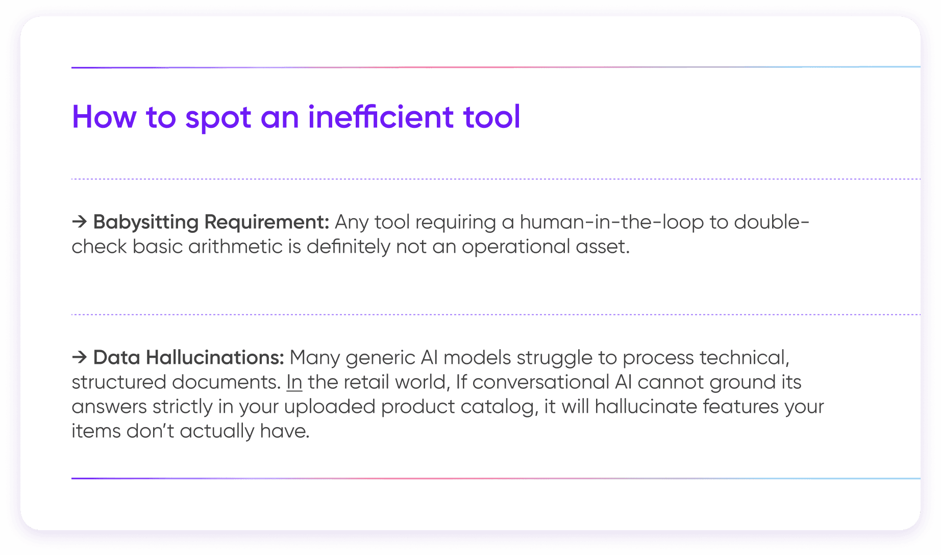 Planners are spending more hours mastering a tool’s specific interface or prompt engineering than they do actually leveraging the results. If you are "babysitting" an AI to prevent hallucinations, you are not automating; you are just managing a more temperamental intern. This friction inherent in many AI productivity tools often creates an efficiency gap. And when constant manual oversight replaces workflow automation, AI for e-commerce becomes a liability.