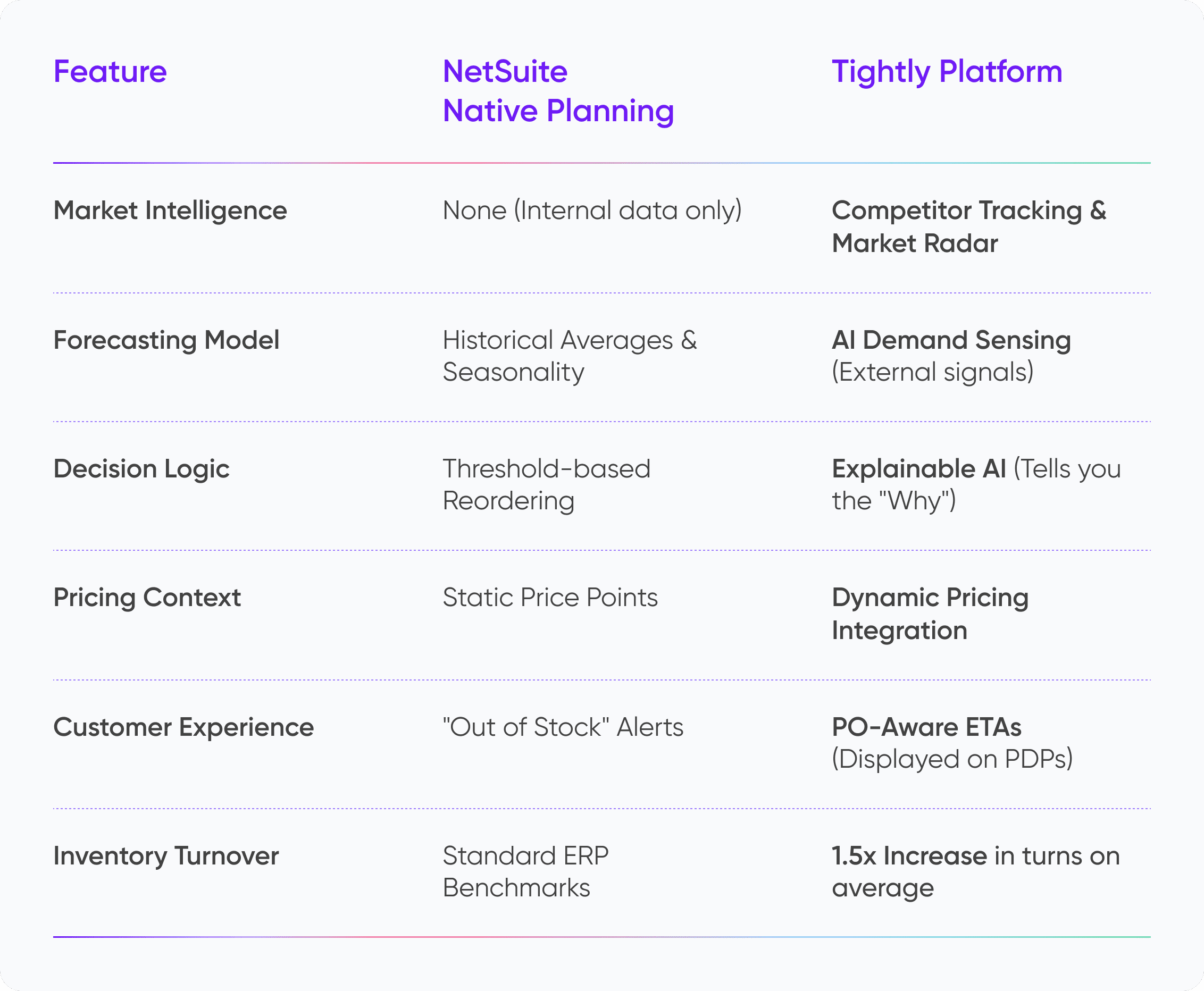 Let’s be honest: NetSuite is the gold standard for a reason. Their 2026.1 updates have moved the platform far beyond its origins as a digital filing cabinet for orders , turning it into a highly autonomous supply chain control tower. But for high-growth brands, "native" features can still feel a bit too basic for the level of complexity you're managing..While NetSuite remains the perfect System of Record, Tightly is the essential System of Intelligence required for inventory excellence.